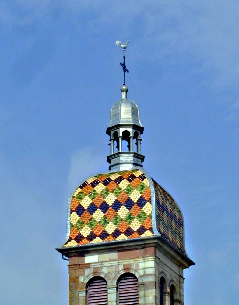 Travaux - Restauration du la charpente et de la couverture du clocher comtois en tuiles vernissés, zinguerie.